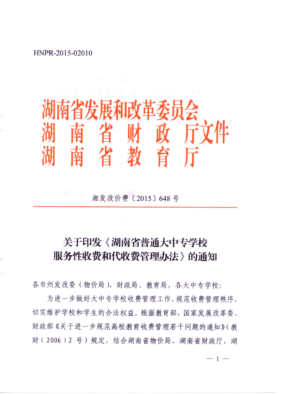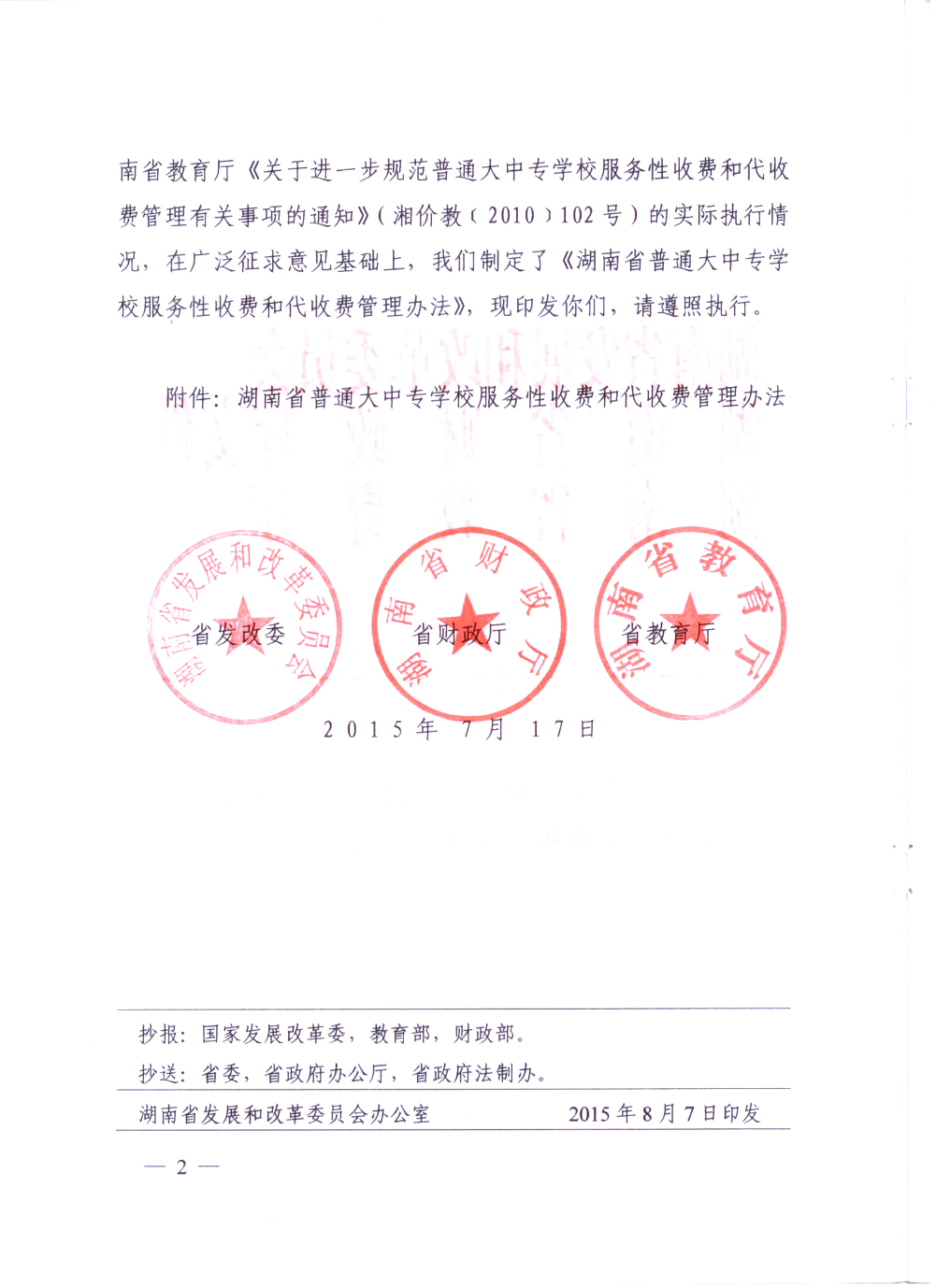 为进一步做好大中专学校收费管理工作,规范收费管理秩序,切实维护学校和学生的合法权益。根据教育部、国家发展改革委、财政部《关于进一步规范高校教育收费管理若干问题的通知》(教财﹝2006﹞2号)规定,结合湖南省物价局、湖南省财政厅、湖南省教育厅《关于进一步规范普通大中专学校服务性收费和代收费管理有关事项的通知》(湘价教﹝2010﹞102号)的实际执行情况,在广泛征求意见基础上,我们制定了《湖南省普通大中专学校服务性收费和代收费管理办法》,现印发你们,请遵照执行。